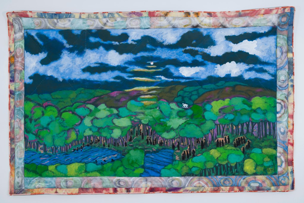 Faith Ringgold, Coming to Jones Road #4: Under a Blood-Red Sky, 2000. Acrylic on canvas with fabric borders, 78 ½ x 52 ½ in. (199 x 133 cm).