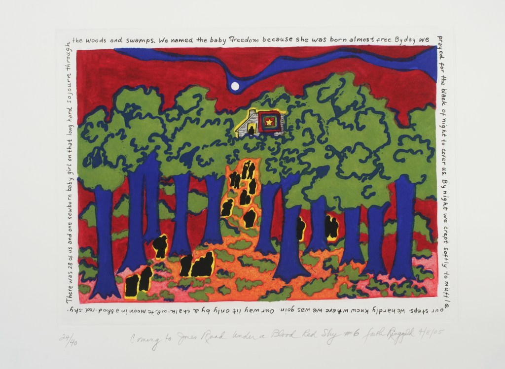 Instead of creating work based in anger, she decided to find a way to create something uplifting that would honor all of those whose sacrifices carried her forward. About Jones Road Ms. Ringgold says, “I have tried to couple the beauty of this place with the harsh realities of its racist history to create a freedom series that turns all of the ugliness of spirit, past and present into something livable.” In her Coming to Jones Road series, Ringgold created art to transform her hostile reception into a story of survival and transcendence. In paintings, serigraphs, lithographs, and mixed media works using quilted fabric and painting, Ms. Ringgold celebrates her ancestors and their journeys along the Underground Railroad that brought her to Harlem and then finally to her home and a studio in New Jersey.